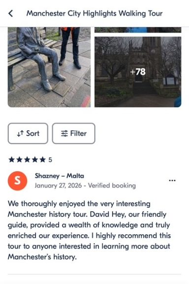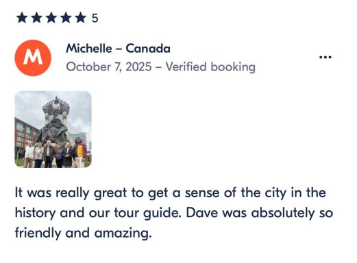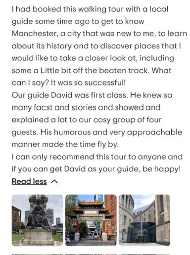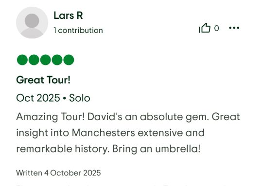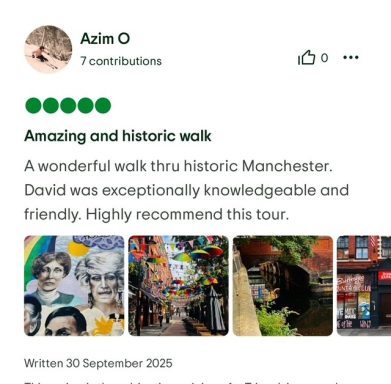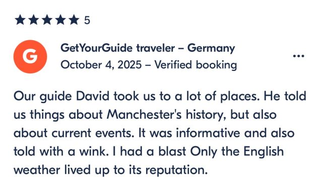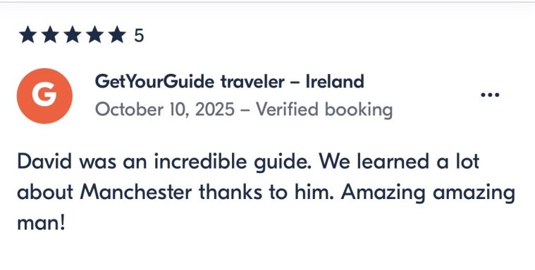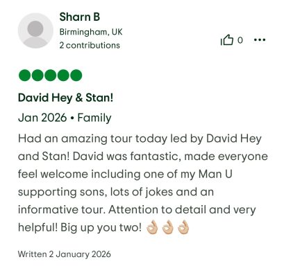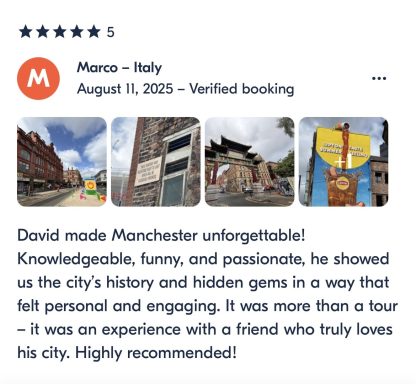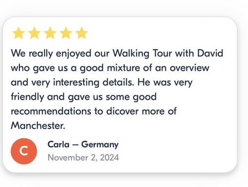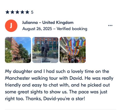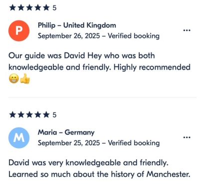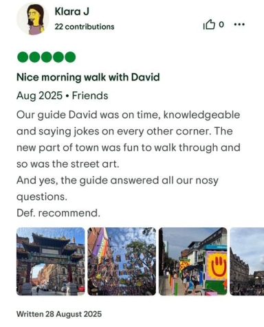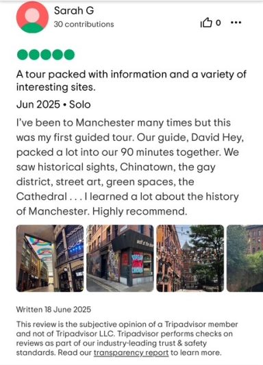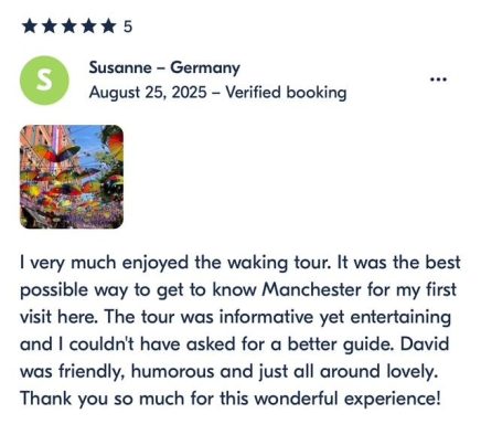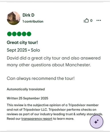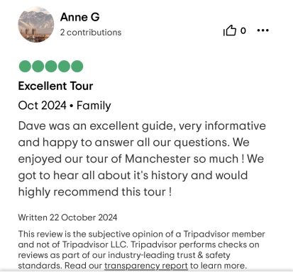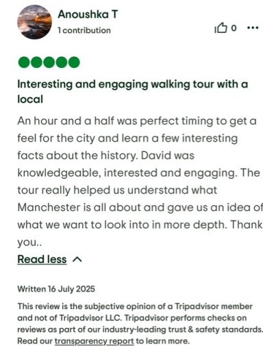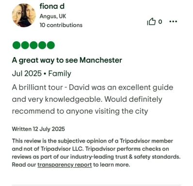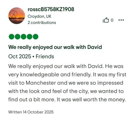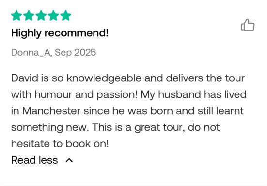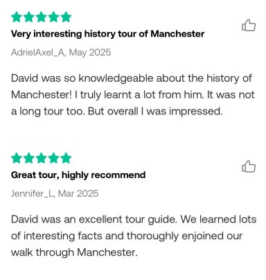 "This was a great tour - the guide David was brilliant, he was great fun and gave us lots of interesting information as we walk around Manchester. We had never been to Manchester beforeso it was a great introduction and I would recommend it" Ciboney94, Isle of Sheppey UK.