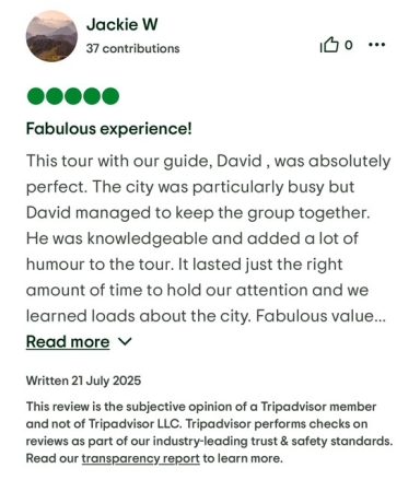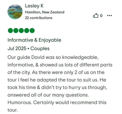 “David was an exceptional guide. The tour was easily walkable and time flew by. It was a perfect blend of history, fun tales and city knowledge”