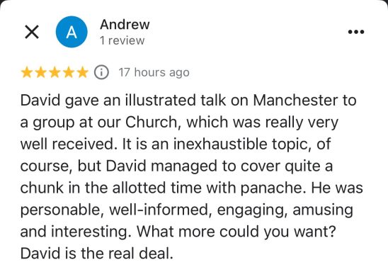 I’m available for talks on the history of Manchester and my connections to the city and also Lay Preaching appointments (I’m a locally accredited Lay Preacher with the United Reformed Church.